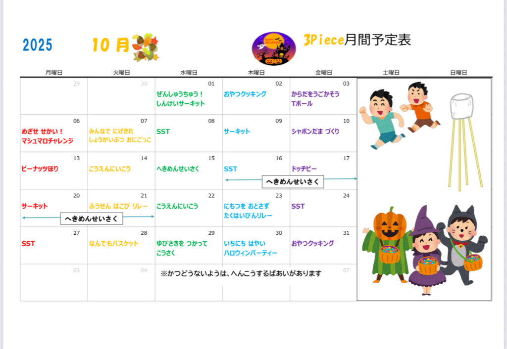 お知らせ 😈10月の活動予定表🎃 2025.09.24 広島県福山市にある放課後等デイサービス3Pieceです🧩朝晩とだいぶ涼しくなり、秋らしくなってきましたが体調管理が難しい季節ですね😓10月の活動予定表が完成しました♪ぜひご覧ください‼️ 🍇9月の活動予定表🍇 前の記事 👻10月の活動予定表🍭 次の記事