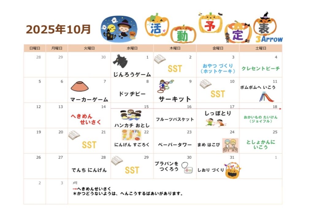 お知らせ 👻10月の活動予定表🍭 2025.09.24 広島県福山市新市町戸手にある放課後等デイサービス3Arrowです🩵天候が不安定な季節ですが、少しずつ涼しくなり散歩するのが気持ちいい季節になりました✨今月の活動予定表が完成したのでぜひご覧ください☺️ 😈10月の活動予定表🎃 前の記事 ✴️すり〜ぴ〜す通信✴️ 次の記事