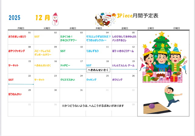 お知らせ ⛄️12月の活動予定表🎄 2025.11.18 広島県福山市山手町にある放課後等デイサービス3Pieceです🧩急に寒くなり、インフルエンザも流行っていて体調管理が難しいなぁ〜と感じる日々です💦12月の活動予定表が完成したので見ていただければと思います☺️ 🪅クリスマス🎄の飾り付け🤶 前の記事
