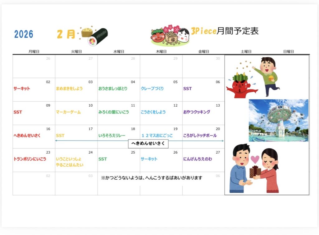 お知らせ ✴️2月活動予定表✴️ 2026.01.21 広島県福山市山手町にある放課後デイサービス3Pieceです🧩あっという間に1月も下旬になりましたが寒くて雪が降る日もありますね⛄️そんな中でも子ども達は毎日元気に来所してくれています♪2月の活動予定表が完成したのでご案内します。 Screenshot 💙すりあろ通信💙 前の記事