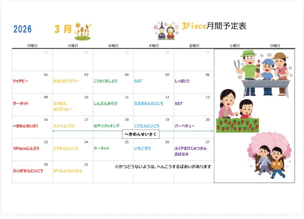 お知らせ ✴️3月の活動予定表✴️ 2026.02.26 広島県福山市山手町にある放課後等デイサービス3Pieceです🧩まだ朝晩は寒いですが、日中は暖かく春が来るなと感じる季節になりましたね✨3月の活動予定表ができました☺️3月後半は春休みでもあり、楽しい活動が満載です🎶ぜひ、ご覧ください☆ Screenshot ♣️最近流行ってる自由遊び♥️ 前の記事
